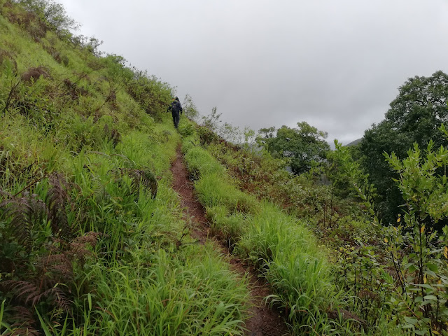 आता पुन्हा एकदा चढण सुरु झाली. आता शिखराच्या मुख्य धारेवर आम्ही येऊन पोहोचलो होतो. चढाईचा मार्ग मागच्या बाजूने होता. त्यामुळे खालून दिसणारा (किंबहुना दिसू शकणारा) शिखराचा तो विशिष्ट आकार इथून नजरेस पडत नव्हता. समोर दिसत होती ती निव्वळ डोंगराच्या अंगाने वर-वर चढत जाणारी वाट. डोंगराच्या बेचक्यांमध्ये बांबू फोफावला होता. अधे-मधे रानफुलं दिसत होती. सोबतीला जळवा होत्याच. जसजसे वर चढत होतो तसा वाऱ्याचा वेग वाढत होता. एका मोठाल्या खडकापाशी ती वाट येऊन अडखळली. इथून डाव्या हाताने खडी चढण सुरु होत होती. घोंघावणारा वारा आता तोललेल्या थेंबांना बाणांसदृश अंगावर फेकून मारत होता. त्याच्याकडे दुर्लक्ष करत आम्ही ती खडी चढण चढू लागलो.