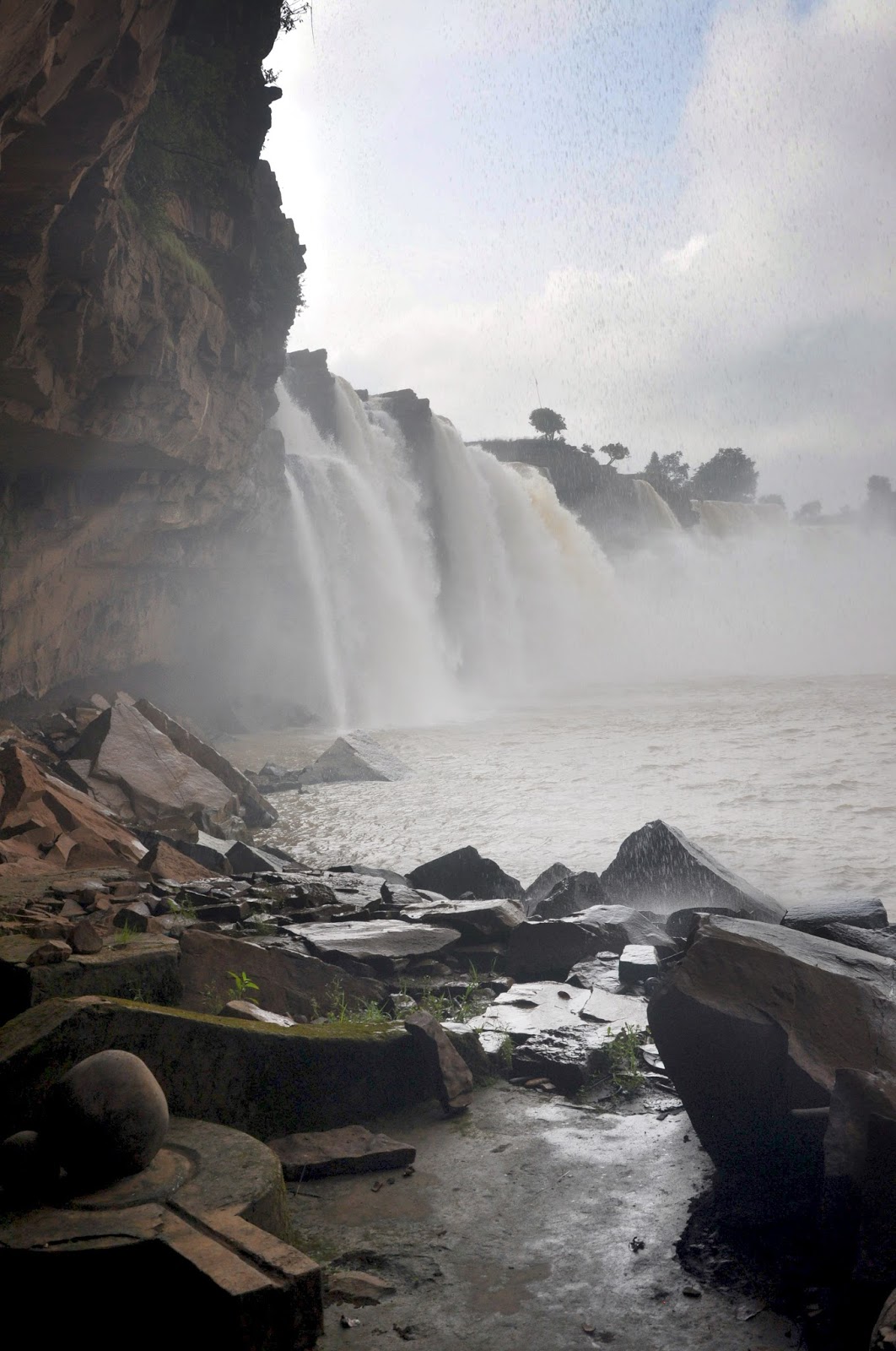 आता डावीकडे उंच कडा आणि उजवीकडे नदीचे पात्र अशा चिंचोळ्या पट्ट्यातून ती वाट जात होती. कड्याच्या पोटात काही गुहा खोदलेल्या दिसत होत्या. त्यात काही शिवलिंगे आणि कोरीव मूर्तीही दिसत होत्या. कधी काळी इथे एखादे मंदिर असावे. काही अंतरातच ती वाट प्रचंड शिळांच्या ढिगाऱ्यात हरवली. पुढे जाणे धोकादायक होते. आम्ही तिथेच थांबलो. धबधब्याचा ध्रोंकार आता कानांवर आदळत होता. प्रवाहाची एक लहानशी धार कुठूनतरी वेगळी होऊन डावीकडच्या कड्यावरून समोरच्या दगडावर कोसळत होती. त्याचे तुषार अंगावर उडत होते. त्या अस्ताव्यस्त पसरलेल्या शिळा, बाजूला विखुरलेले कोरीव भग्नावशेष, आणि समोरचा तो महाकाय जलप्रपात त्या जागेला एक अद्भुत आयाम देत होते. तिथे थोडेफार फोटो काढून मी काही क्षण ती जागा अनुभवत शांत उभा राहिलो. समोर कोसळणारी ती धार खुणावत होती. फार विचार न करता मी सरळ त्या धारेखाली जाऊन बसलो. थंड पाणी मस्तकावर आदळले आणि एक शिरशिरी देहात जाणवली. क्षणभर कुडकुडलो, पण लगेचच त्या तापमानाला शरीर सरावले, आणि मन त्या प्रवाहाशी जणू एकरूप झाले. ब्रह्मानंद म्हणतात तो हाच का?