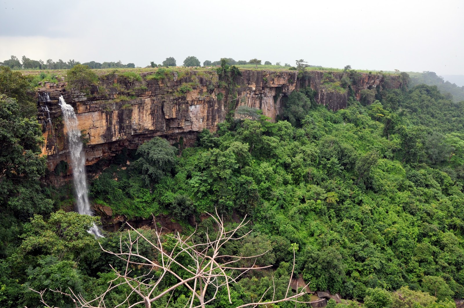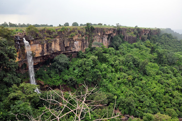 अर्ध्या तासातच आम्ही एका पठारावर येऊन पोहोचलो. तिथे इतरही काही गाड्या पार्क केलेल्या दिसत होत्या. पण धबधबा काही कुठे दिसत नव्हता. लांब कुठेतरी लोकं जमलेली दिसत होती. त्यापुढे दरी आणि तिथेच धबधबा असावा बहुतेक. आम्ही त्या दिशेने चालत पुढे निघालो. थोडं अंतर जाताच वाऱ्याचा वेग वाढलेला जाणवला. हा नक्कीच दरीतून उसळून वर येणारा वारा. आता उत्सुकता अजूनच ताणली जात होती. पाचेक मिनिटं पुढे गेलो आणि एक विस्तीर्ण दरी नजरेस पडली. नजर जाईल तिथपर्यंत घनदाट झाडीने ती दरी व्यापलेली होती. दरीच्या डाव्या कोपऱ्यातून एक पांढरीशुभ धार खाली कोसळताना दिसत होती. पठाराच्या खडकाचा तांबूस रंग आणि दाट वनश्रीचा गडद हिरवा रंग त्या शुभ्र फेसाळत्या धारेला उठाव देत होते. वाऱ्याच्या वेगाने मधेच ती धार विस्कळत आणि हेंदकाळत होती. जणू धारेतले ते थेंब वाऱ्याच्या मदतीने रोलरकोस्टर राईडचा अनुभव घेत होते.
