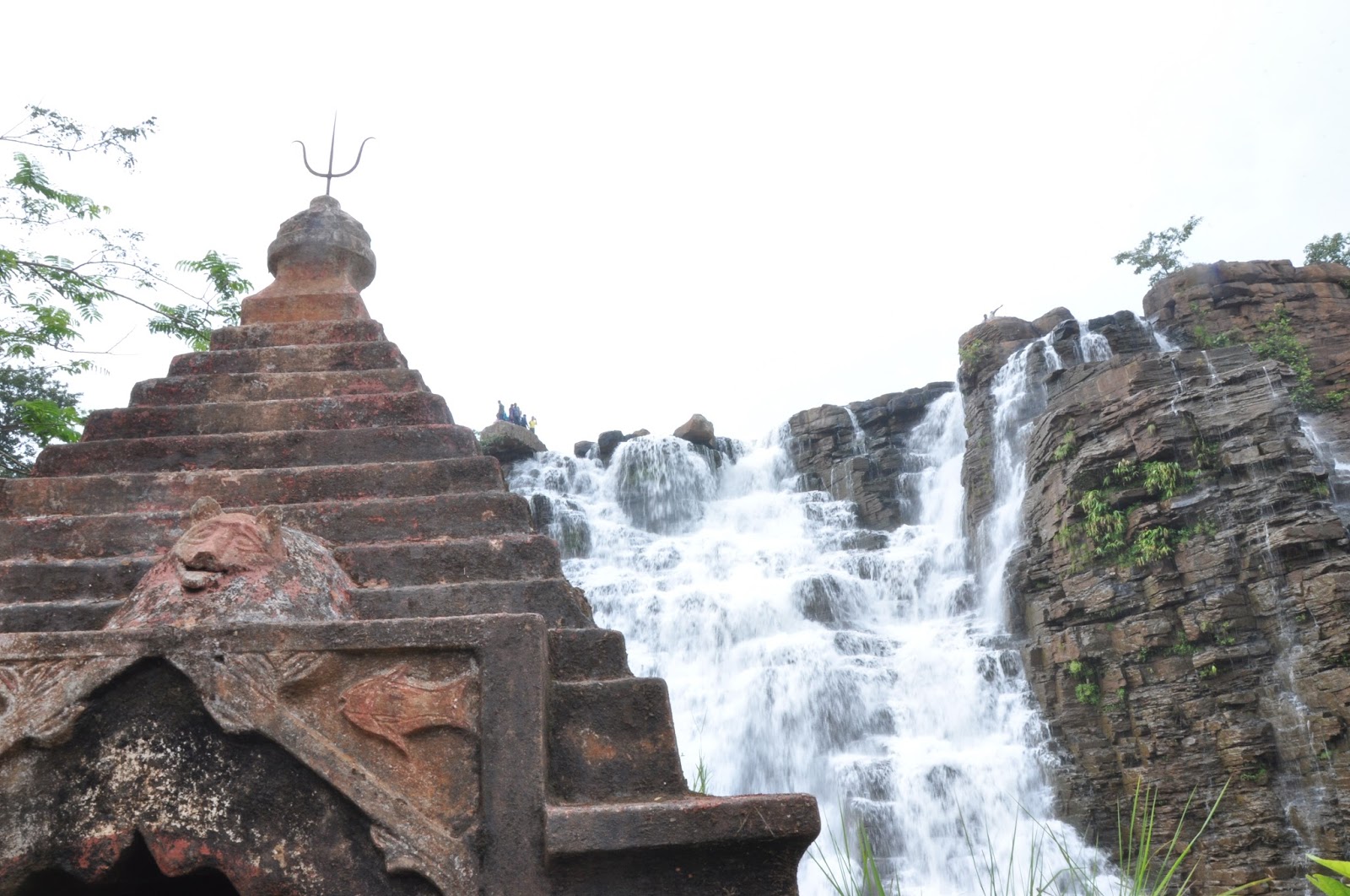 आता आम्ही धबधब्याच्या बरोबर समोर आलो होतो. इथला खडकाळ परिसर अगदीच निसरडा झाला होता. लहान-मोठी पाण्याची डबकी तयार झाली होती. एक-दोन ठिकाणी दगडी पूल बांधून सरकारने पर्यटकांचे चालणे थोडे सोयीस्कर केले होते. आम्ही त्यावरून वाट काढून पुढे गेलो. इथे काही तुरळक गर्दी होती. काही लोक पाण्याच्या प्रवाहात बसून मस्त डुंबत होते. काही जण नुसतेच फोटो काढत होते. उजव्या हाताला एक लहानसा उंचवटा दिसत होता. धबधब्याचे पाणी त्याच्या दोन बाजूंनी वाहत होते. तिथून फोटो छान येईल म्हणून मी त्यावर चढलो. तशा वर जायला पायऱ्या वगैरे होत्या. पण सगळीच वाट फार निसरडी झाली होती. काळजीपूर्वक वर गेलो. वर एक लहानसे शिवमंदिर होते. त्याच लालसर दगडात बांधलेले ते मंदिर त्या भूदृश्यावर फारच उठून दिसत होते. समोरून वाहणारा धबधबा, आजूबाजूची गर्द वनराई, पाण्याच्या आवाजाने भारलेला आसमंत, अशा वातावरणात कोणाच्या मनात अध्यात्मिक भावना येणार नाहीत? मंदिर अगदी लहानसेच होते. नित्यपूजेत नव्हते तरी पिंडीवर दोन-चार फुले वाहिलेली दिसत होती. मंदिराच्या प्रांगणातून धबधब्याचा तो प्रवाह एखाद्या पांढऱ्या चादरीसारखा दिसत होता. दूरवर उजव्या कोपऱ्यात प्रवाहाची आणखी एक लपलेली धार दिसत होती. अगदी वरच्या टोकाला मुंगीएवढी माणसे खाली डोकावताना दिसत होती. हा तोच बिंदू जिथे काही वेळापूर्वी आम्ही बसलो होतो. थोडा वेळ तिथे फोटोग्राफी करून मी खाली उतरलो.