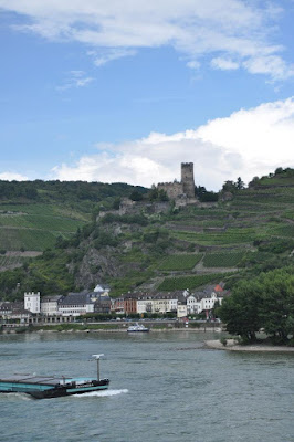The river-bed was wide. I could see even large boats plying up and down the river. The slopes of mountains on both sides of the river were lined with vineyards. The rows of grape vines gave the mountains a ‘combed hair’ look. The road and the railway meandered between the hills and the river. The cycle lane was on the edge of the road, along the river bank. Vast gardens, an occasional beer-garden, a campsite or sometimes a jetty for embarking and disembarking interrupted the bank along the route. After a short ride, the well-known castles atop the mountains started making their appearance. Some were as grand as a palace while others were like a small mansion. Built somewhere between the 12th and 14th century AD, these castles are an excellent example of the then prevailing style of architecture. I continued my journey, stopping in between to take a photograph or two of the castles and the river. On my way, I reached a village called Oberwiesel. There is a medieval observation tower on the border of the village. Atop a mountain behind the village stands a beautiful mansion. This is called Schünburg. Amongst the many castles found in the area, this castle and the village of Oberwiesel are popular with tourists. The river takes a magnificent turn here and adds to the beauty of the place. After bit of photography around the place, I moved on.