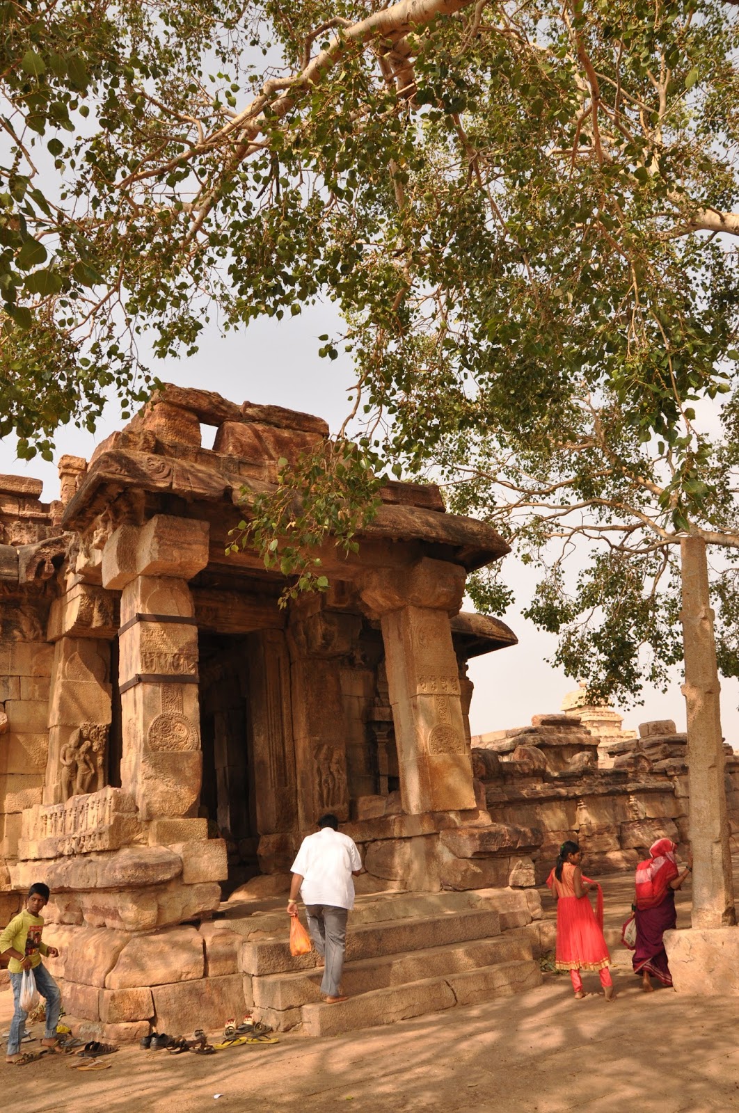 आत शिरल्याबरोबर उजव्या हाताला काडसिद्धेश्वर आणि जंबुलिंगेश्वर अशी दोन लहान मंदिरे होती. मंदिरांची शिखरे ढासळलेली असली तरी बाकीची रचना तशी मजबूत होती. दोन्ही मंदिरांचा मूळ आकार चौरसाकृती होता. सातव्या शतकाच्या सुरुवातीला बांधली गेलेली ही मंदिरे नागर शैलीत बांधलेली होती. काडसिद्धेश्वर मंदिराच्या शिखरावर अग्रभागी नृत्यमग्न शिवाची विलक्षण मूर्ती लक्ष वेधून घेत होती. या मंदिराच्या इतर बाजूंना काही इतर मूर्ती कोरल्या होत्या. गर्भगृहात फारशी प्रकाशयोजना नव्हती. कदाचित देवासोबत होणाऱ्या संवादात प्रकाशाचा व्यत्यय नको असावा. जंबुलिंगेश्वर मंदिराच्या बाहेर अर्धभग्न अवस्थेतला नंदी दिसत होता. तिथून थोडं पुढे जाताच दिसले संगमेश्वर मंदिर. हे पट्टदकलमधील सर्वात जुने मंदिर आहे. चालुक्य राजा विजयादित्य याने आठव्या शतकात हे मंदिर बांधले. हे तुलनेने मोठे होते. याची रचना द्राविड शैलीतली होती. मंडप आणि प्रदक्षिणा मार्ग अजूनही सुस्थितीत होते. मंडपातील खांबांवरचे कोरीवकाम लक्ष वेधून घेत होते. इतक्या बारीक तपशीलांसह एक खांब पूर्ण करायला किती वेळ लागला असेल त्या काळी? किती मोबदला मिळत असेल त्या कारागिरांना? आणि हे कौशल्य कधी आणि कसे अस्तंगत झाले? अशा असंख्य प्रश्नांनी मनात गर्दी केली होती. मंदिराचे अंतरंग अनुभवायला म्हणून आत शिरलो. गर्भगृहाच्या भोवतालचा प्रदक्षिणा मार्ग खुणावत होता. त्या अंधाऱ्या मार्गावर वरच्या झरोक्यातून झिरपणारा सूर्यप्रकाश एक विलक्षण वातावरण निर्मिती करत होता. एक प्रदक्षिणा पूर्ण करून मी मंडपात आलो. एका कोपऱ्यात बसून बदामी मध्ये विकत घेतलेले पुस्तक चाळू लागलो. थोडावेळ तिथे विश्रांती-वाचन करून मी पुढची मंदिरे बघायला निघालो.