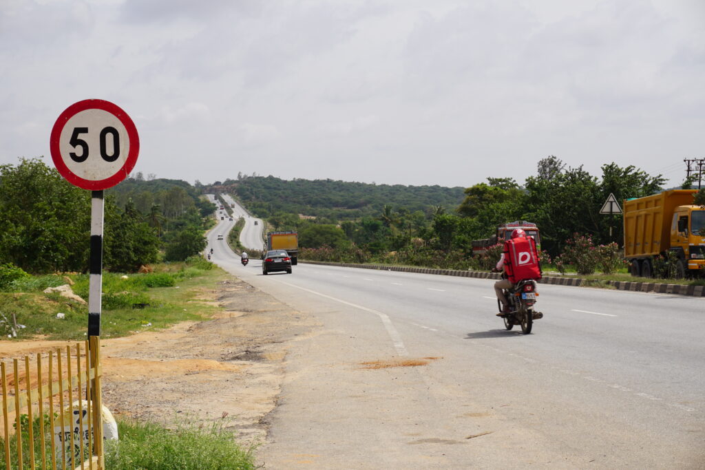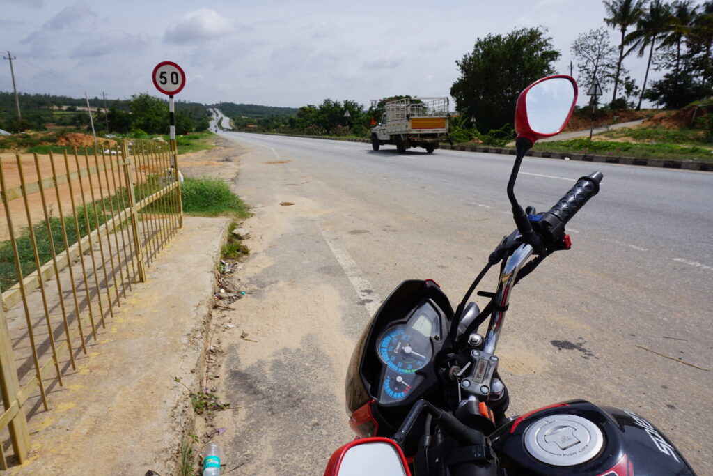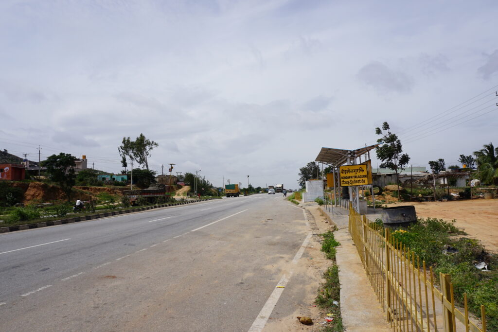 The morning was cool with cloudy skies and a chilly wind. Being the early hours of a Saturday, Bangalore roads were blissfully free. I soon navigated through the busiest streets and started the long haul on the Bangalore–Hyderabad highway. As I left the highlands of Bangalore behind, the weather slowly warmed, and the landscape turned increasingly arid. The thick, grey blanket of clouds that had clung to Bangalore’s skies was now scattered into tiny, furball-like pieces. These small clouds played a delightful game of hide-and-seek with the sun, casting a mesmerizing light-and-shadow effect across the vast farmlands. The weather was perfect for a long ride.