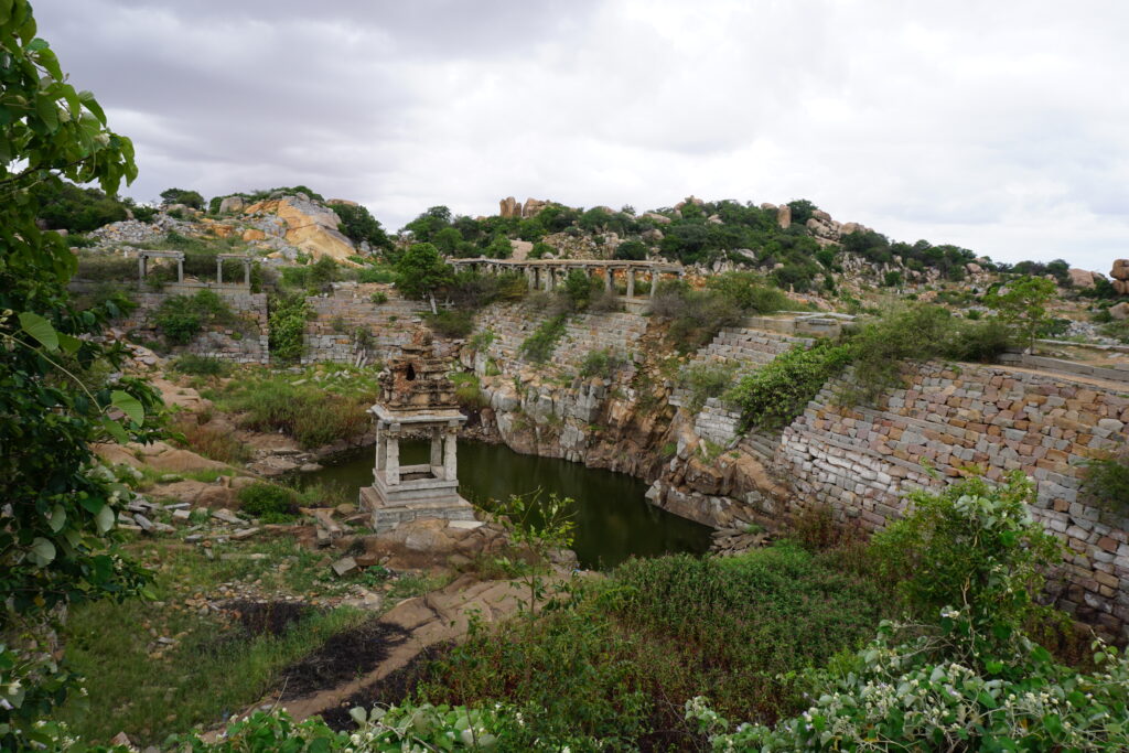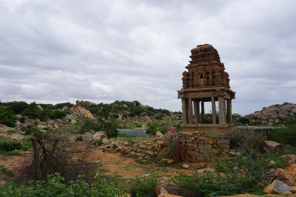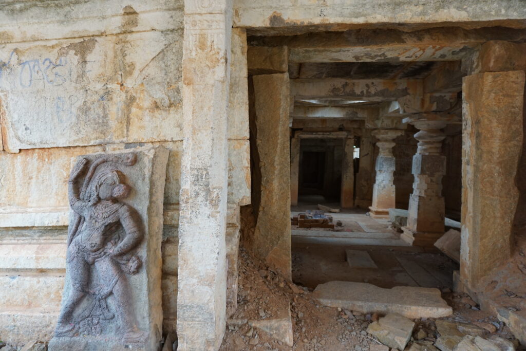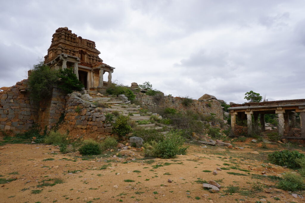 In about 30 minutes, I reached the hilltop. The air up here was much cooler. To my left stood the ruins of the Lakshmi-Narasimha temple. I climbed the steep stairs of the Gopuram and entered the temple premises. Though in ruins, the overall structure was quite intact: the Gopuram, the Mandapam, the Garbha-griha—everything was recognizable. A small Hanuman statue was placed at the entrance. The air was filled with a mystic silence, disrupted only by the slow wind blowing through the broken walls and pillars. It was quite an “another-world-like” moment.