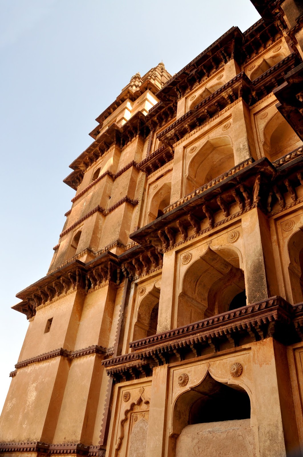 आम्ही मुळात उत्सुक होतो गच्चीवर जाण्यात. एका मनोऱ्याच्या जिन्यावरून आम्ही वर चढू लागलो. हे सगळे खरेच एखाद्या चर्चसारखे वाटत होते. मधल्या सज्ज्यावर चार बाजूंना चार सुशोभित गवाक्षे बांधली होती. त्यांपैकी एक गवाक्ष थेट राधा-कृष्णाच्या मूर्तीचे दर्शन घडवत होते. तिथून मग आम्ही गच्चीवर पोहोचलो. कुठलाच कठडा नसलेली ही गच्ची काहीशी असुरक्षितच होती. मात्र संपूर्ण शहराचा अप्रतिम देखावा इथून दिसत होता. विशेषतः समोरचा जहांगीर महाल अगदीच उठून दिसत होता. इथे एक मुख्य शिखर, एक उपशिखर, आणि त्याच्या पुढे मशीदीवर असतो तसा एक घुमट दिसत होता. मंदिराच्या स्थापत्यविशारदाने नक्की काय विचार करून अशी स्थापत्यघटकांची सरमिसळ केली असेल देव जाणे! पण त्यातून घडलेले स्थापत्यरत्न अद्भुत होते एवढे नक्की!
