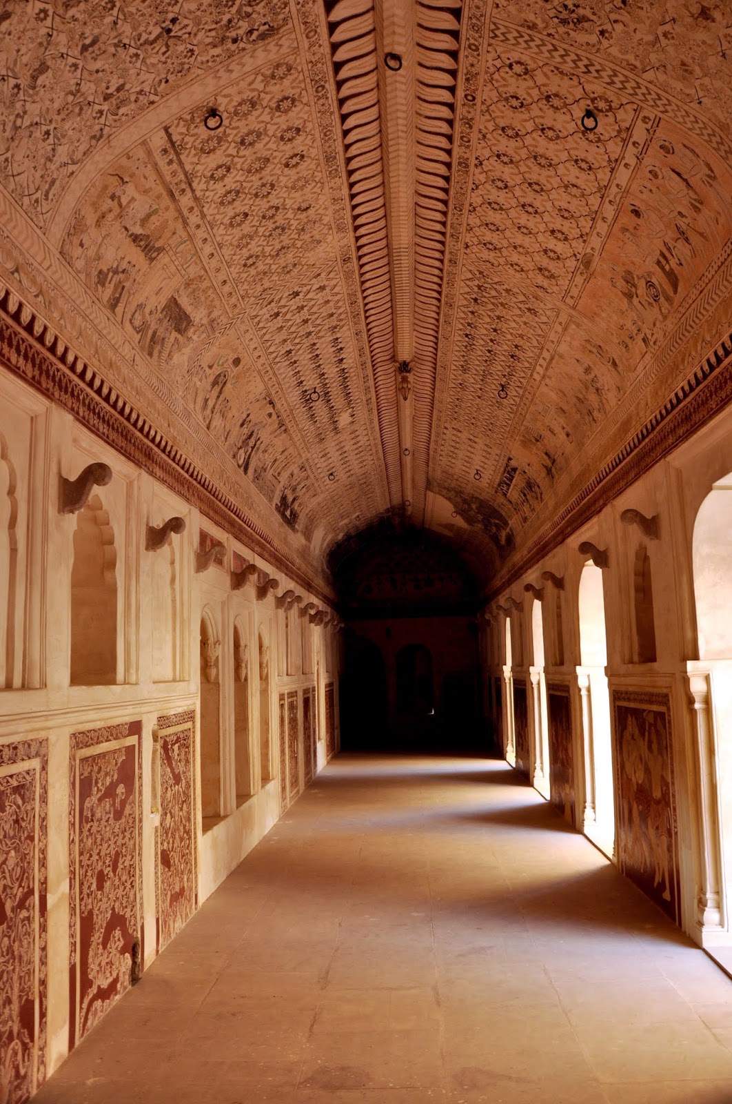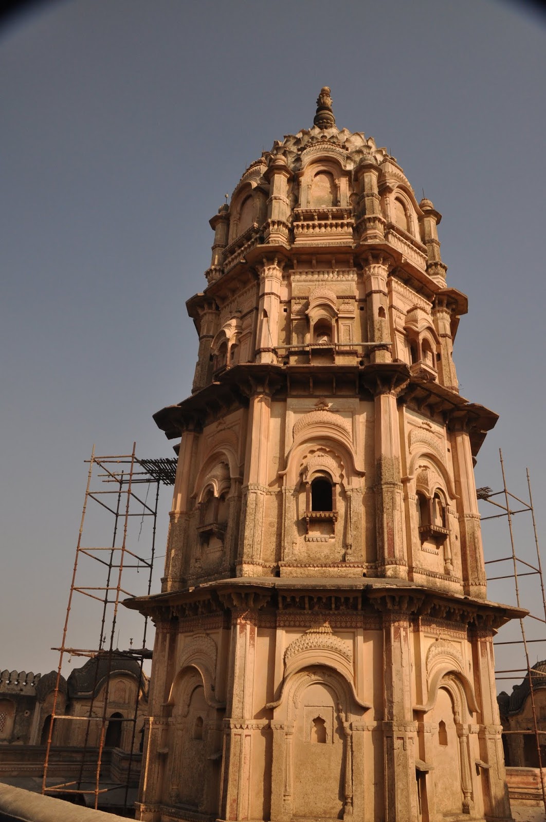 प्रथमदर्शनी तर ती वास्तू एक किल्लाच वाटत होती. चार बाजूंनी उंच संरक्षक भिंती, कोनांवर बुरुज, तटबंदीवर तोफांसाठी भोकं, असे एखाद्या भुईकोट किल्ल्यासारखे मंदिराचे रूप होते. मध्यभागी एक उंच मनोरा होता. हा मनोरा म्हणजेच मुख्य शिखर. मुख्य प्रवेशद्वारातून आम्ही आत शिरलो. गाभाऱ्याच्या चारही बाजूंनी विस्तृत आयताकृती दालने होती. त्यांच्या भिंतींवर आणि छतांवर सुरेख चित्रे काढलेली होती. यातील बरीचशी चित्रे रामचरितमानस या साहित्यकृतीवर बेतलेली होती. काही चित्रे राजामहाराजांची होती. एका बाजूने मुख्य मनोऱ्यावर जाणारा जिना होता. इथेही वर चढताना एखाद्या चर्चचा आभास होत होता. गच्चीवरून थोडेफार फोटो काढून आम्ही शहराकडे परत निघालो.
