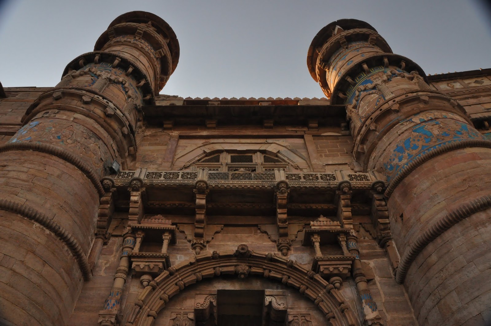 महाल आतून फिरून झाल्यावर आम्ही बाहेरच्या व्यू पॉइंट वर आलो. इथून एका बाजूला अवघे ग्वाल्हेर शहर दिसत होते तर दुसऱ्या बाजूला मन मंदिर महालाची सुरेख तटबंदी. इथले दृश्य म्हणजे जणू ग्वाल्हेरचा ट्रेडमार्क! हलका वारा सुटला होता. दुपारची वेळ असली तरी इथे डोंगरावर गारठा जाणवत होता. आम्ही थोडा वेळ तिथे टेकलो. प्रकाश विरुध्द दिशेने होता. पण या जागी फोटो नाही काढून कसं चालेल? तिथून जवळच महालाचे मुख्य द्वार होते. याची रचना तर अफाट होती. दोन बाजूंनी उत्तुंग मनोरे, मधल्या भागात एक निरीक्षण सज्जा, कमानीच्या आकाराचा प्रचंड दरवाजा, आणि भिंतींवर रेखाटलेले सुरेख नक्षीकाम, सारेच अद्भुत होते. इथे थोडीफार फोटोग्राफी करून आम्ही किल्ल्याच्या इतर भागाकडे वळलो. मन मंदिर महालाच्या मागच्या बाजूला गुजरी महाल, कर्ण महाल, विक्रम महाल असे अजूनही काही महाल आहेत. यांपैकी काही महाल चांगल्या अवस्थेत आहेत तर काही अगदीच जीर्णावस्थेत. तिथे एक फेरफटका मारला आणि मंदिरांकडे वळलो.