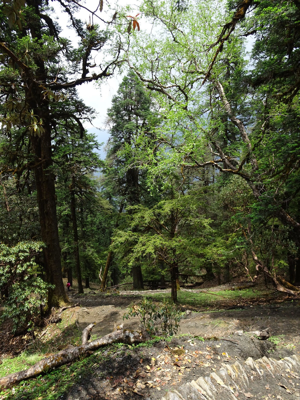 हळूहळू बुग्यालचा सपाट प्रदेश मागे पडला. तीव्र उतार सुरु झाला. म्हणता म्हणता वाट सरळ गच्च रानात शिरली. त्या उंच झाडांतून निळ्या आभाळाचे लहान-सहान तुकडे मिचमिचताना दिसत होते. वातावरणातली आर्द्रता जाणवत होती. इथे ऱ्होडोडेंड्रॉनची झाडे मुबलक दिसत होती. पण कदाचित या भागातला फुलांचा बहर येऊन गेला होता. फांद्यांच्या टोकांवर फुटलेली हिरवीगार पालवी मोहक दिसत होती. उंच आणि धिप्पाड असे देवदार वृक्ष उतारावर घट्ट मुळे रोवून खंबीरपणे उभे होते. उद्या प्रलय होऊन जग उलटे-पालटे झाले तरी हे वृक्ष जागचे हलणार नाहीत असा दृढ विश्वास त्यांच्या नुसत्या अस्तित्वातून प्रतीत होत होता. या वाटेने चढणे नक्कीच अली बुग्यालच्या वाटेपेक्षा जास्त कठीण होते. इथून चढणारे ट्रेकर्स अजून किती चढायचे आहे असे केविलवाण्या चेहऱ्याने विचारत होते. तसेही ट्रेकिंगमध्ये या प्रश्नाचे उत्तर कधीही “तुम्ही जवळपास पोहोचलातच” असेच द्यायचे असते! आम्हीही तोच कित्ता गिरवत होतो. वर चाललेल्या ट्रेकर्सना शुभेच्छा देत आम्ही खाली उतरत होतो.