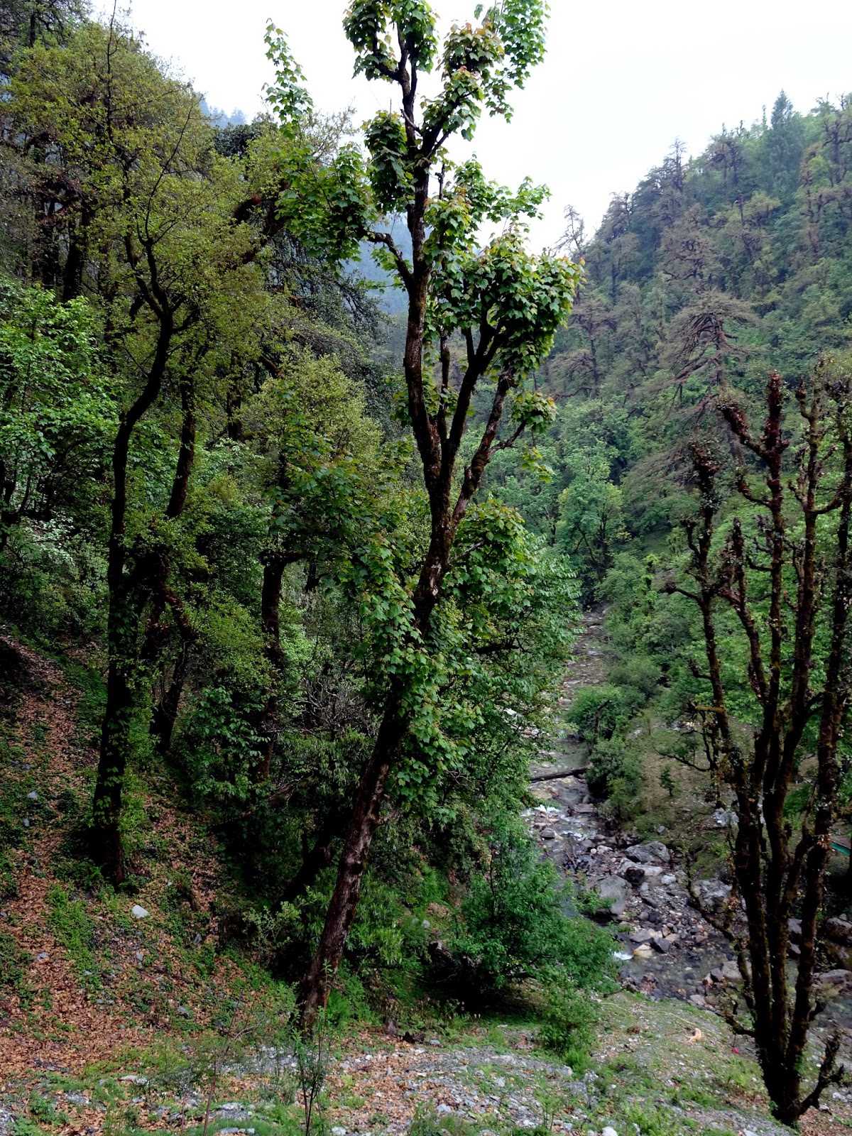 त्या अरुंद दरीतून नीलगंगेचा अवखळ प्रवाह खळखळ करत पुढे चालला होता. आजूबाजूचे डोंगर आणि वृक्षराजी त्या प्रवाहात आपले रुपडे पाहण्यात गुंतले होते. आतापर्यंत अनुभवलेल्या रौद निसर्गरुपांपुढे हे शांत आणि लोभस रूप मानला एक वेगळाच आनंद देत होते. बूट काढून नदीच्या पाण्यात पाय बुडवले. थंडगार पाण्याचा पायांना स्पर्श होताच सारा थकवा दूर झाल्यासारखे वाटले. काश त्या पाण्यात यथेच्छ डुंबता आले असते. पण अजून एक चतुर्थांश अंतर बाकी होते. नाईलाजानेच पाण्याबाहेर आलो. गरमागरम राजमा चावल तयारच होते. जेवण होतंय ना होतंय तेवढ्यात ढग दाटून आले आणि पावसाच्या सरी सुरु झाल्या. हा पाऊस काही आमचा पिच्छा सोडायला तयार नव्हता. ट्रेकमधल्या प्रत्येक दिवशी साधारण दुपारच्या वेळी वेळापत्रक ठरल्यागत तो हजेरी लावत होता. आता शेवटचे एक चतुर्थांश अंतर पावसात पार करणे अगदी जीवावर आले होते. पण दुसरा पर्याय काय? रेनकोट घातले आणि चालायला सुरुवात केली.