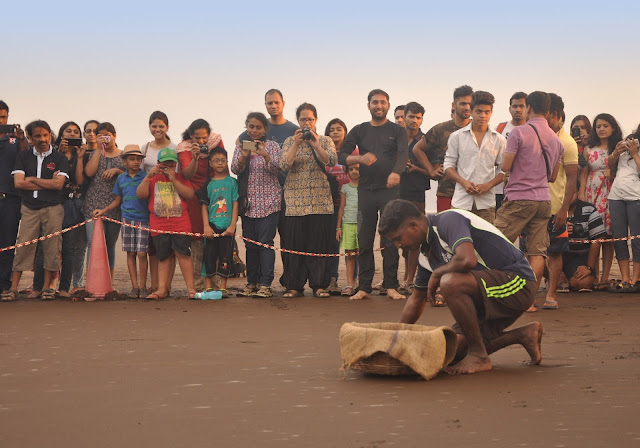 इतरही बरेच पर्यटक होते. आज किती पिल्ले दिसतील याची उत्सुकता सर्वांनाच होती. एकूण चार घरटी होती. त्यावर टोपल्या उलट्या करून ठेवलेल्या होत्या. सातच्या सुमारास श्री उपाध्याय आणि इतर काही स्वयंसेवक आले. पहिली टोपली उचलली गेली. इथे एकही पिल्लू नव्हते. पर्यटकांमधून निराशेचा सूर उमटला. दुसऱ्या टोपलीखाली मात्र दोन इवलीशी पिल्ले त्यांच्या आयुष्यातला पहिला दिवस अनुभवत होती. पिल्लं पाहताच पर्यटकांनी एकच जल्लोष केला. तिसऱ्या टोपलीखाली अजून दोन तर चौथ्या टोपलीखाली चार पिल्ले सापडली. तळहातापेक्षाही लहान अशी ती गोंडस पिल्ले चोहीकडे टकामका बघत होती. मनुष्याजातीशी एवढा जवळचा संपर्क त्यांच्या पूर्वजांचा कधी आला नसेल. ती सारी पिल्ले स्वयंसेवकांनी एका टोपलीत घातली आणि सारे जण समुद्राकडे जाऊ लागले. पाण्यापासून १०-१२ मीटर अंतरावर एक चौकोनी जागा दोरखंड लावून बंदिस्त केली गेली. मग त्याच्या आतमध्ये पिल्लांना अलगद ओल्या वाळूवर सोडण्यात आले. लाटांच्या आवाजाने समुद्राचा अंदाज घेऊन ती पिल्ले हळूहळू समुद्राकडे चालू लागली. त्यांच्या हालचालीचे सुंदर ठसे ओल्या वाळूवर उमटत होते. मधेच एखादे पिल्लू उलट्या दिशेने जात होते व गोल फिरून योग्य मार्गाला लागत होते. पर्यटक मोठ्या उत्साहने पिल्लांची ती लगबग पाहत होते. छायाचित्रकारांचा उत्साह तर ओसंडून वाहत होता. अखेरीस सगळ्या पिल्लांना समुद्राने आपल्या पोटात सामावून घेतले. पिल्लांना मनोमन आयुष्यमान भव असे शुभ चिंतन करून आम्ही आमच्या मुक्कामाच्या ठिकाणी जायला निघालो.